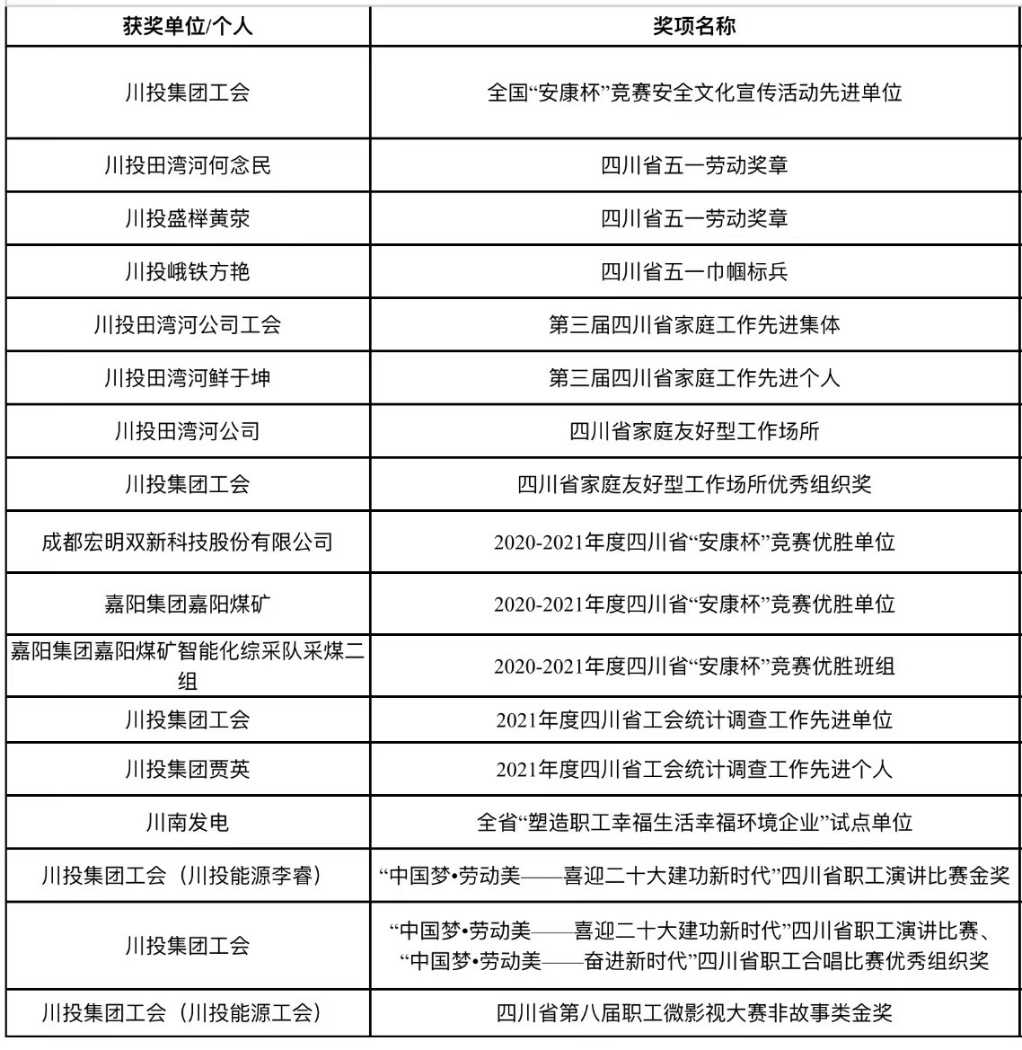 川投集团工会坚持以“服务基层、服务职工”为宗旨,围绕中心、服务大局,切实推进各类推优评先工作,2022年度全集团工会系统斩获全国、全省各类荣誉表彰26项。