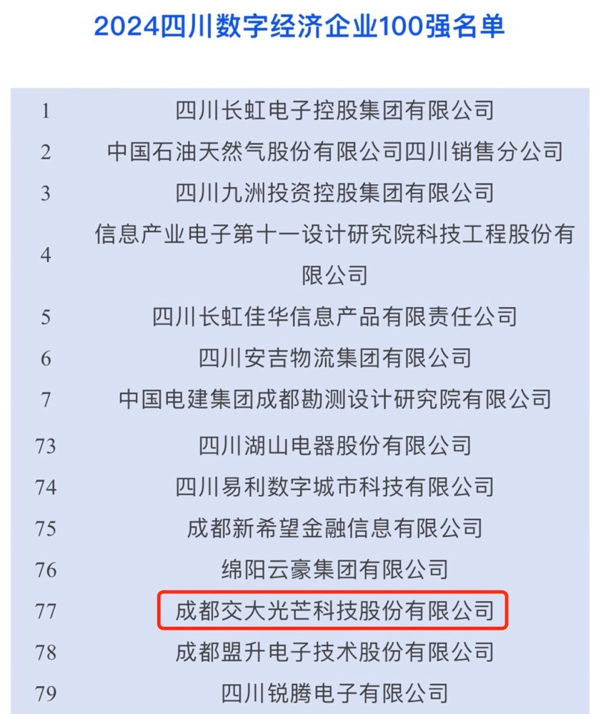 9月26日,由四川省企业联合会、四川省企业家协会主办的2024四川大企业大集团发展大会在成都召开。会上,发布了2024年四川省综合、制造业、服务业百强、数字经济100强企业榜单。交大光芒荣登四川数字经济企业100强榜单,位列第77位。