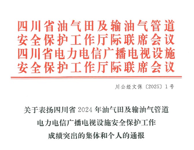 近日,四川省电力电信广播电视设施安全保护工作厅际联席会议通报表彰了四川省2024年油气田及输油气管道、电力电信广播电视设施安全保护工作成绩突出集体和个人。集团公司将评选对象重点向基层一线单位和个人倾斜,积极开展择优评选推荐上报工作,川投集团所属达州气电公司荣获“成绩突出集体”,川投电力公司总经理蔡承德荣获“成绩突出个人”。