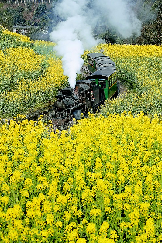 3月4日,嘉阳小火车穿过油菜花海。