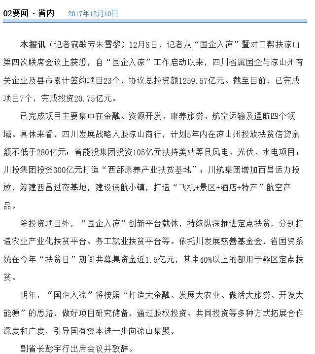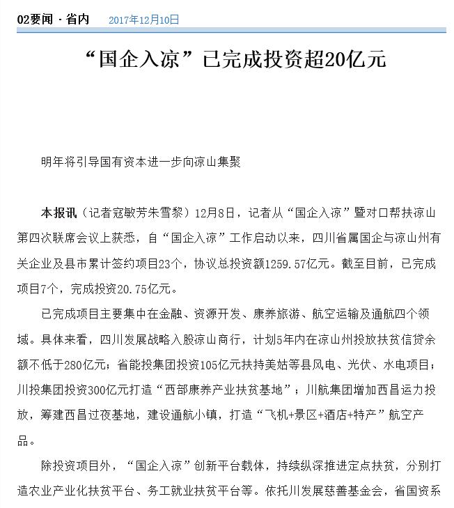 本报讯(记者寇敏芳朱雪黎)12月8日,记者从“国企入凉”暨对口帮扶凉山第四次联席会议上获悉,自“国企入凉”工作启动以来,四川省属国企与凉山州有关企业及县市累计签约项目23个,协议总投资额1259.57亿元。截至目前,已完成项目7个,完成投资20.75亿元。