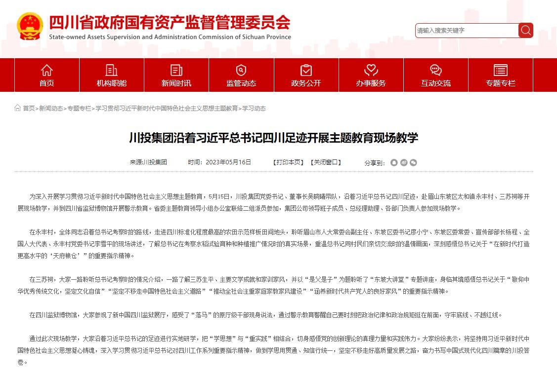 为深入开展学习贯彻习近平新时代中国特色社会主义思想主题教育,5月15日,川投集团党委书记、董事长吴晓曦带队,沿着习近平总书记四川足迹,赴眉山东坡区太和镇永丰村、三苏祠等开展现场教学,并到四川省监狱博物馆开展警示教育。省委主题教育领导小组办公室联络二组派员参加,集团公司领导班子成员、总经理助理、各部门负责人参加现场教学。