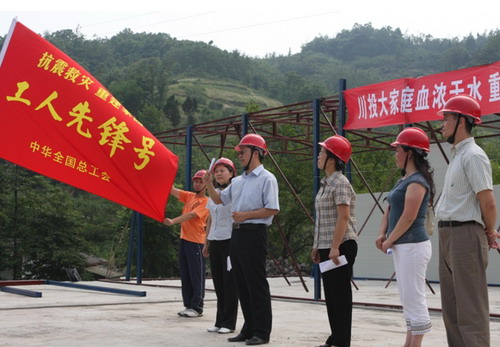 授旗仪式结束后,大家在鲜红的“工人先锋号”旗帜下合影,从废墟中站起来的天彭电力广大职工们脸上露出了自豪的笑容。望着迎风招展的红旗,郭勇总经理笑着问大家准备把这面光荣的旗帜插在哪里,同志们高声回答:报告郭总,报告各位领导,我们要把“工人先锋号”的红旗插遍天彭电力抗震救灾、重建家园的每一个阵地!
