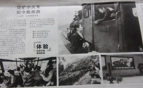 《运矿小火车 如今跑旅游》以近半版的版面图文并茂地展现了小火车及国家矿山公园旅游的火热场景。追述了小火车在数十年中从运煤、客运到旅游专列的功能演变以及时代变迁;反映出了嘉阳集团利用矿山工业遗迹和矿山特色文化发展旅游业,走可持续发展之路,以及矿山在经济转型中的有益探索。这是继《四川工人日报》、《乐山日报》,台湾亚视、中央电视台、四川电视台、成都电视台等纷纷报道小火车旅游之后的又一大亮点。(黄蔚)