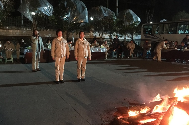 当晚,营地接待中心外的院子里点起了熊熊的篝火,公司营地全体职工欢聚一堂,共同庆祝“三八”国际妇女节。公司合作单位女职工们带来了具有当地民族特色的彝族达体舞,全体员工一起围着篝火尽情地欢跳,一朵朵金色的火花跳跃在空旷的夜空里,随着歌声与小游戏带来的无限的暖意,欢乐的气氛瞬间被点燃,院子里一片欢歌笑语,我们大家一起感受着公司大家庭的温暖。