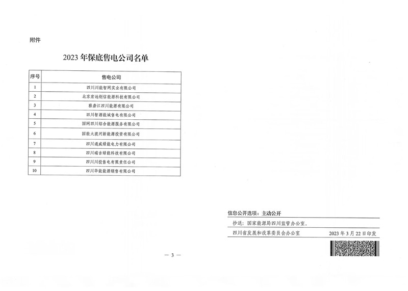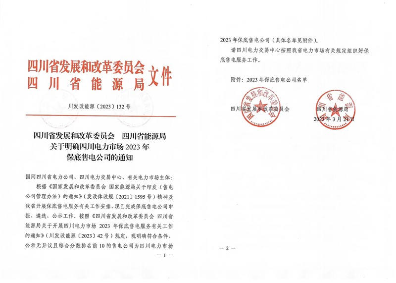 3月22日,四川省发展和改革委员会、四川省能源局印发了《关于明确四川电力市场2023年保底售电公司的通知》(川发改能源〔2023132号),四川川投售电有限责任公司被评定为四川电力市场2023年保底售电公司。