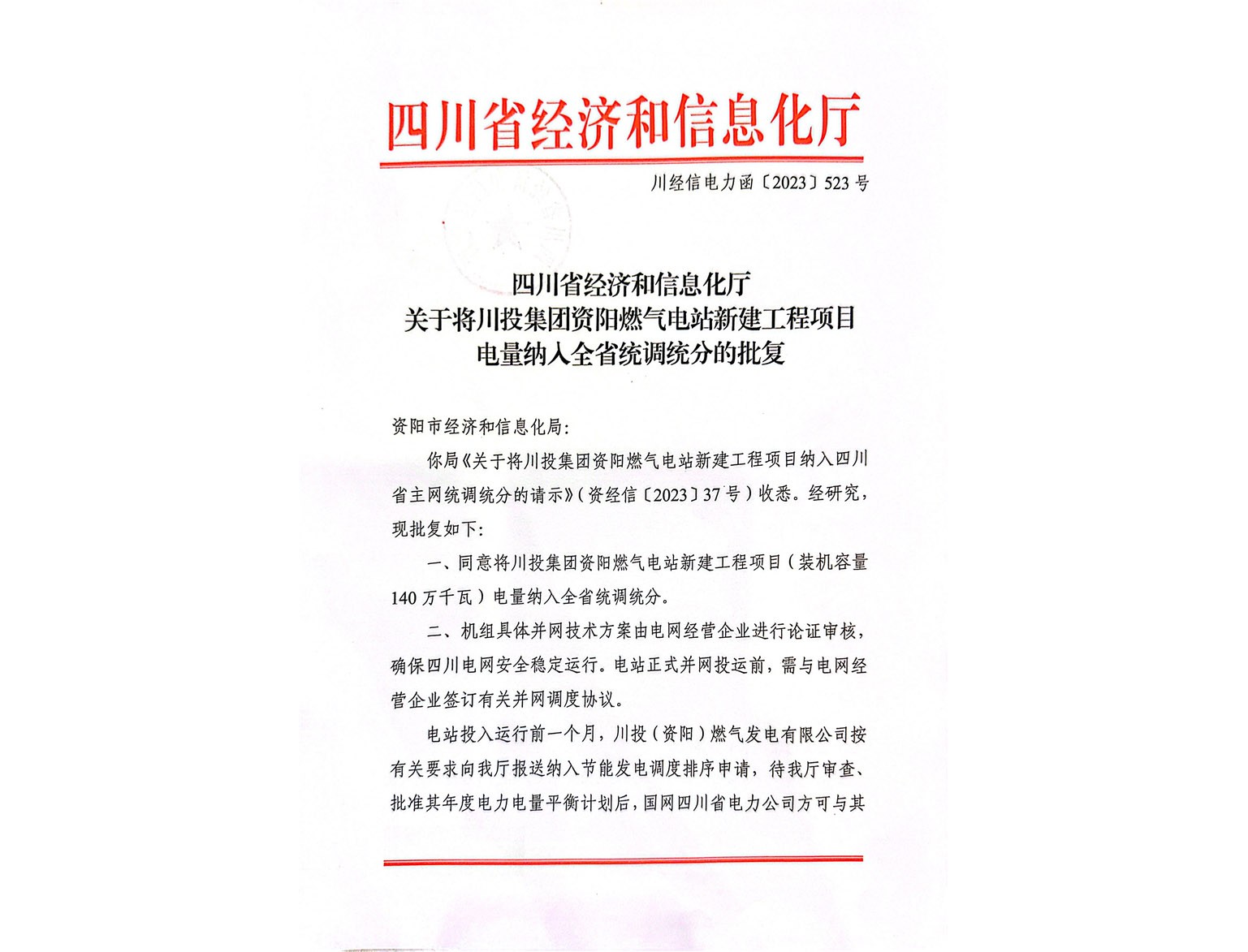 资阳燃气电站核准装机规模为2×70万千瓦等级燃机,按主机设备实际招标结果项目总装机容量为148 万千瓦,是“十四五”规划开局之年省级重点建设项目。电站要实现2024年双机投产发电目标,需将资阳燃气电站电量先纳入全省统调统分。为此,资阳气电安排专人负责,与市县经信局、省经信厅等相关单位沟通协调,在四川省、资阳市政府相关部门和川投集团、川投燃电集团的大力支持下,最终取得了《四川省经济和信息化厅关于将川投集团资阳燃气电站新建工程项目电量纳入全省统调统分的批复》(川经信电力函〔2023〕523号)。