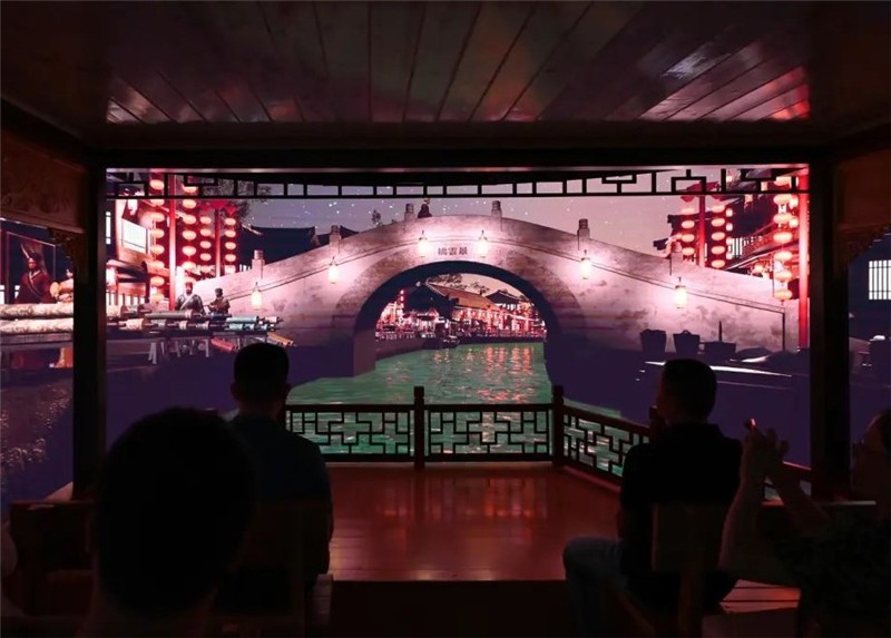 “船在水中行,人在画中游,琳琅满目的夜景、波光粼粼的河水和挑担叫卖的商贩在观众眼前环形屏幕上依次呈现,勾勒出一幅唐代成都夜游美景。”据悉,作为此次调研重点的“七重空间,共生世界”虚拟现实主题馆,于9月7日在四川省人民政府、工业和信息化部主办的2023世界显示产业大会亮相展示。