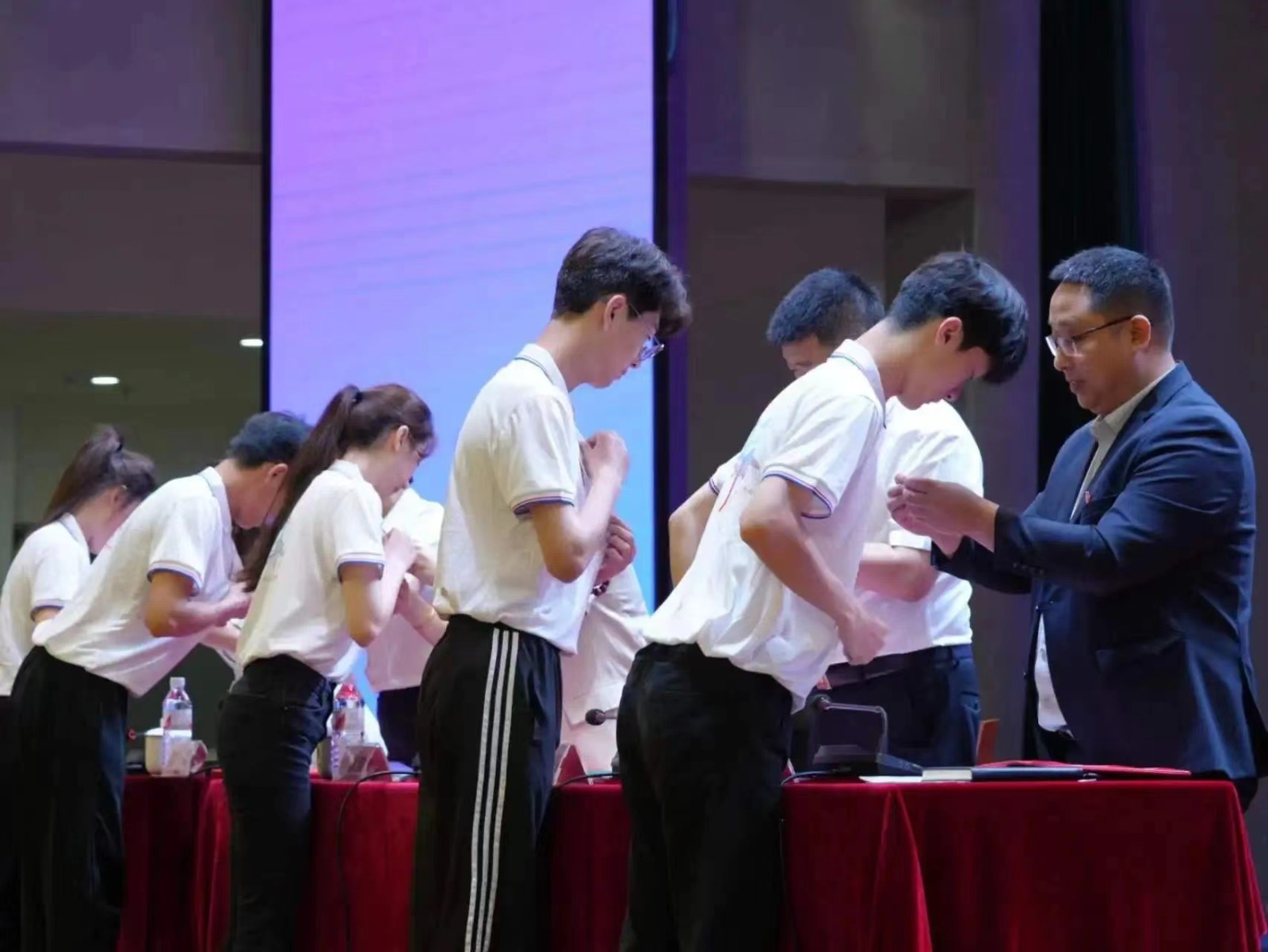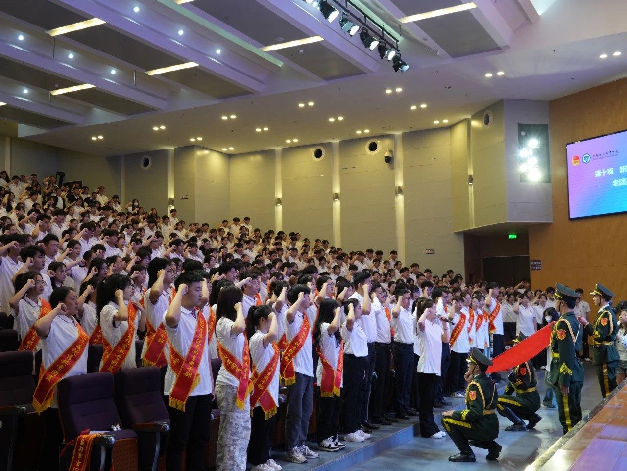 入团仪式上,学生工作部部长许宏君宣读《2024年上半年新团员入团名单》与会领导为新团员佩戴团徽、颁发团员证。全体新老团员庄严宣誓。