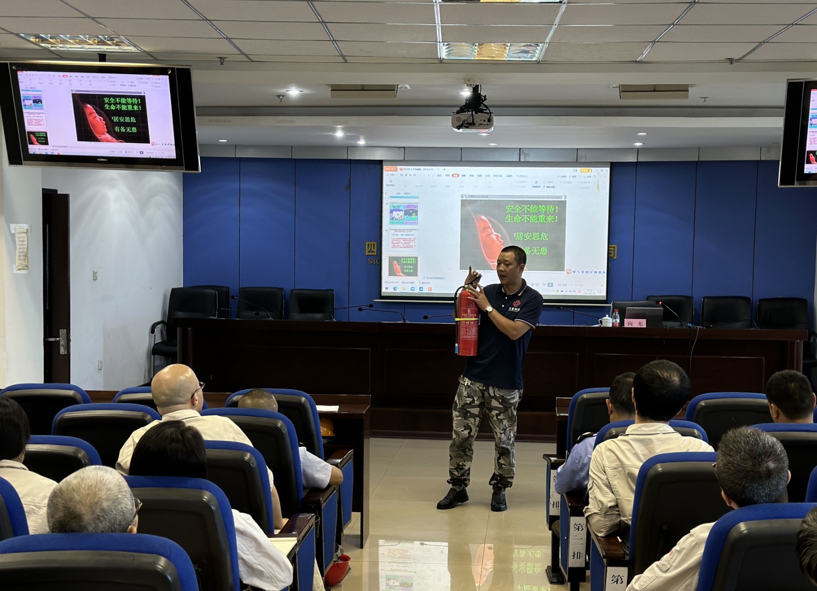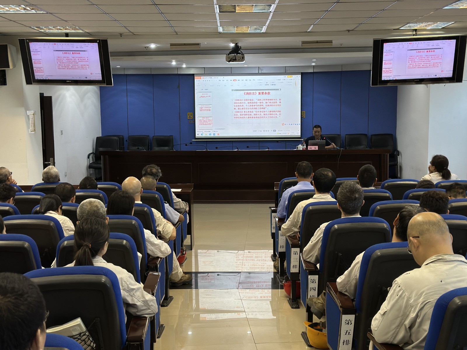 公司在家领导、消防专业检查组成员、各二级单位负责人、专兼职安全员 、工段长、班组长、重点消防岗位员工共计60人参加了专题培训。