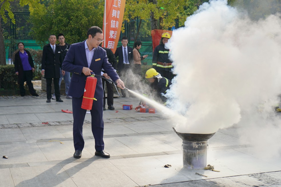本次演练以公司综合馆2楼模拟发生火情为情景,公司及时启动应急救援预案,成功扑灭火情并疏散被困人员到安全区域。工作人员详细讲解、演示了过滤式呼吸面罩、灭火器、灭火毯等常见消防器材的使用方法,参演人员现场学习后,纷纷上前体验了灭火器和灭火毯的实际操作。