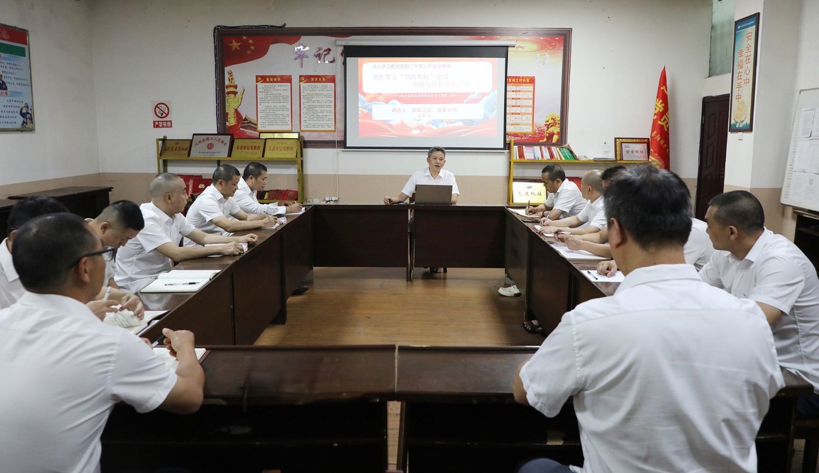8月15日,嘉阳煤矿“张献云技能大师工作室”带头人、2024年“乐山市五一劳动奖章”获得者、嘉阳工匠张献云为采煤二队党员和生产骨干宣讲党的二十届三中全会精神,倡导向新求质提效,助力企业高质量发展。