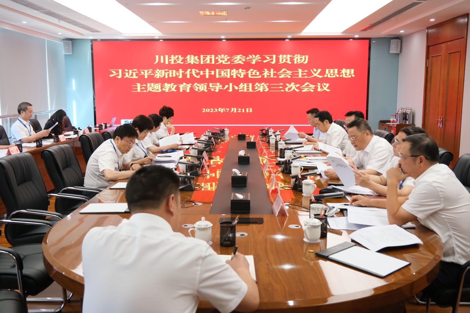 7月21日下午,川投集团党委主题教育领导小组召开第三次会议,集团党委书记、董事长、领导小组组长吴晓曦主持会议并讲话,主题教育领导小组副组长、成员参加会议。